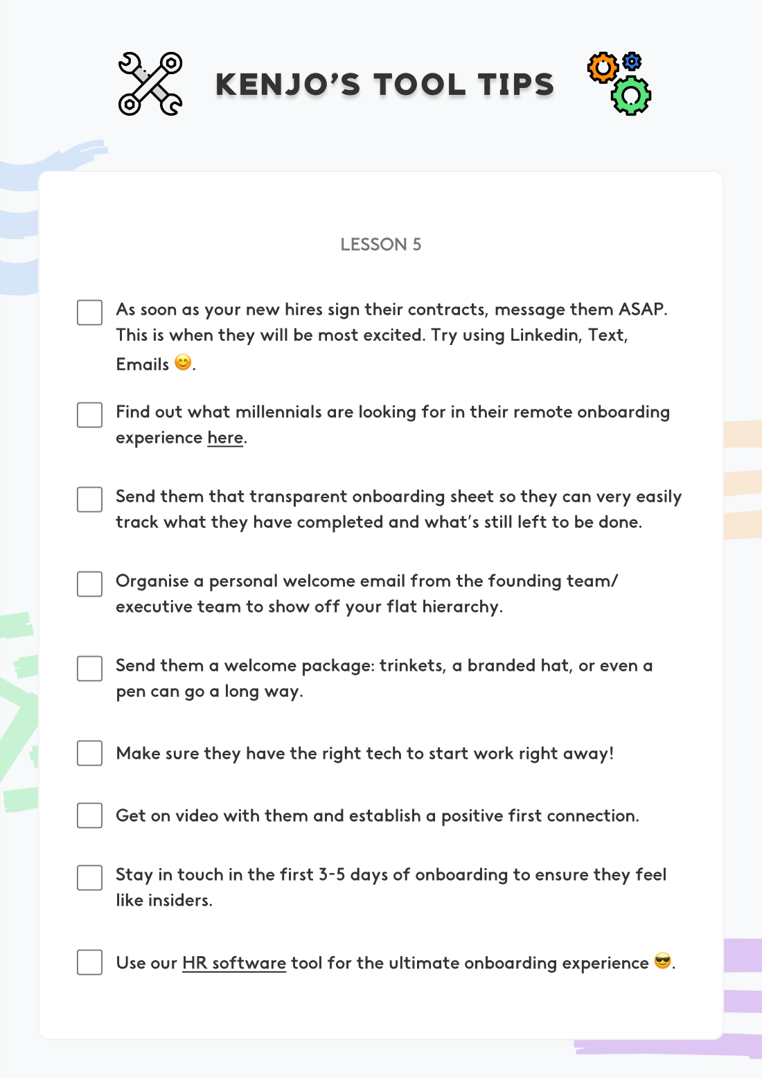 Tech, tools and signatures should always be your first thought, because your new hire needs to be able to start working on the job that they have just been hired for, ASAP 🚀
